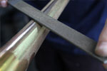 Das normale Oberflächenfinish ist hochglanzpoliert. Hier gibt es die Möglichkeit das Instrument sandzustrahlen oder von Hand zu Bürsten. Dieses hat keine Auswirkungen auf den Klang, nur auf den Glanzeffekt.